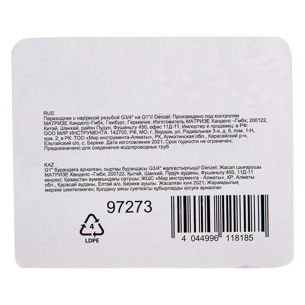 <p>Переходник Denzel 97273 с наружной резьбой используется для быстрого подключения шлангов с резьбой G3/4 и G1 к насосному оборудованию. Пригодится для организации системы водоснабжения на дачном участке.</p><h2>Преимущества</h2><ul><li>Прочность и долговечность — переходник изготовлен из латуни и устойчив к коррозии, а также выдерживает высокое давление.</li><li>Высокое качество исполнения — тщательно обработанная резьба без заусенцев обеспечивает надежное соединение.</li><li>Удобное размещение на стенде — переходник поставляется в комплекте с подвесной картой.</li></ul>