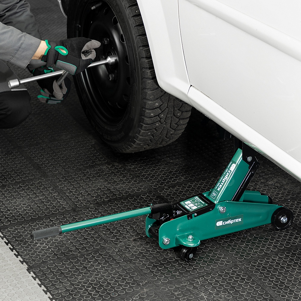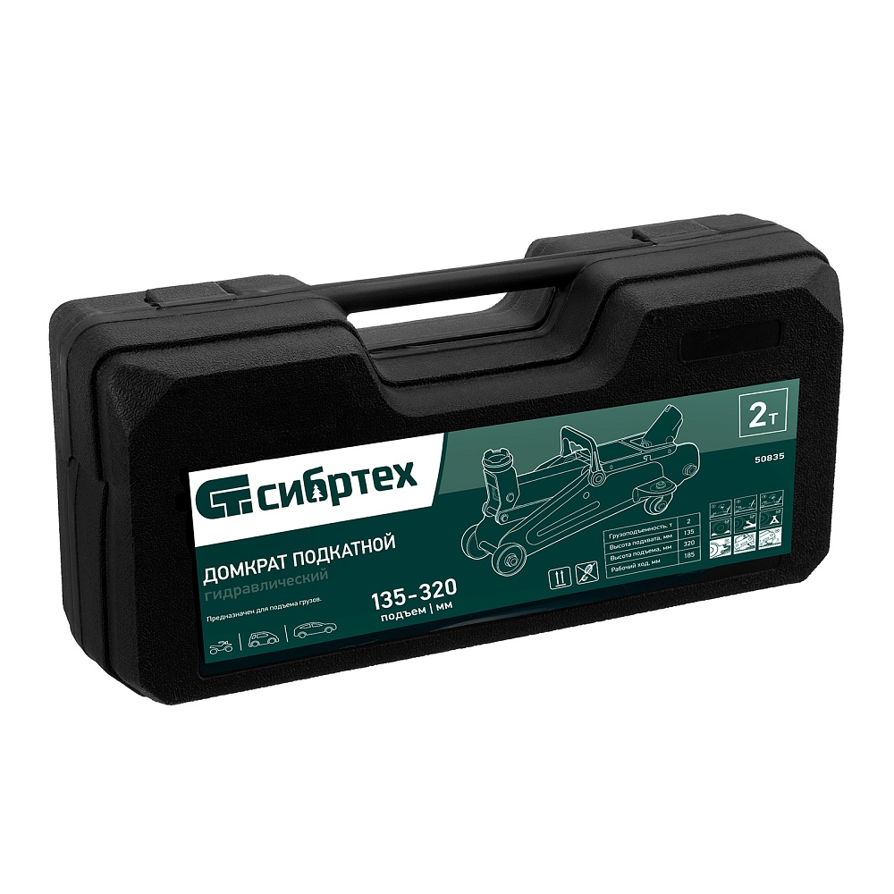 Гидравлический подкатной домкрат Сибртех 50835, поставляющийся в пластиковом кейсе, с высотой подхвата 135 мм, предназначен для подъема грузов массой до 2 т на высоту до 330 мм. Применяется для обслуживания автомобилей со стандартным клиренсом. Компактный домкрат подходит для самостоятельного использования автовладельцами.