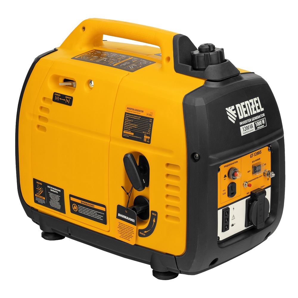 <p>Инверторный генератор Denzel GT-1200iS 94701 мощностью 1,2 кВт, в закрытом корпусе, с ручным стартом, — самый компактный, легкий и экономичный в своей линейке, с ним легко справится даже неопытный пользователь. Идеально подходит для выездов на природу и рыбалку, также будет незаменим на дачном участке и в торговой палатке. Четырехтактный двигатель мощностью 1,8 л.с. и объемом 53,5 куб. см работает стабильно и имеет небольшой уровень шума 52 дБ.</p><h2>Преимущества</h2><ul><li>Высокое качество тока — генератор оптимален для подключения чувствительной электроники: компьютерной техники, газовых котлов с электронным управлением, охранных и пожарных систем.</li><li>Защита от поломки — при низком уровне масла, перегрузке или коротком замыкании двигатель автоматически отключается.</li><li>Долговечность — медная обмотка альтернатора увеличивает срок службы аппарата.</li><li>Надежность — корпус из прочного противоударного пластика защищает внутренние детали от повреждений.</li><li>Визуальный контроль — индикаторы на передней панели информируют о работе генератора, недостаточном уровне масла и о перегрузке.</li><li>Экономичность — электронная система зажигания и электронный регулятор оборотов двигателя позволяют сберечь до 40% топлива, в зависимости от степени загрузки.</li><li>Долгая работа без дозаправки — генератор способен работать почти 3,5 часа на 2,4 л топлива.</li><li>Режим ECO — при работе с небольшой нагрузкой автоматически снижаются обороты двигателя, что позволяет еще больше снизить расход топлива.</li><li>Мобильность — благодаря небольшому весу 14,5 кг и комфортной ручке генератор удобно перемещать.</li><li>Гарантия 3 года — высокое качество генератора подтверждено производителем.</li></ul>