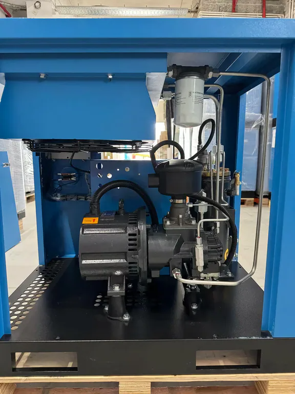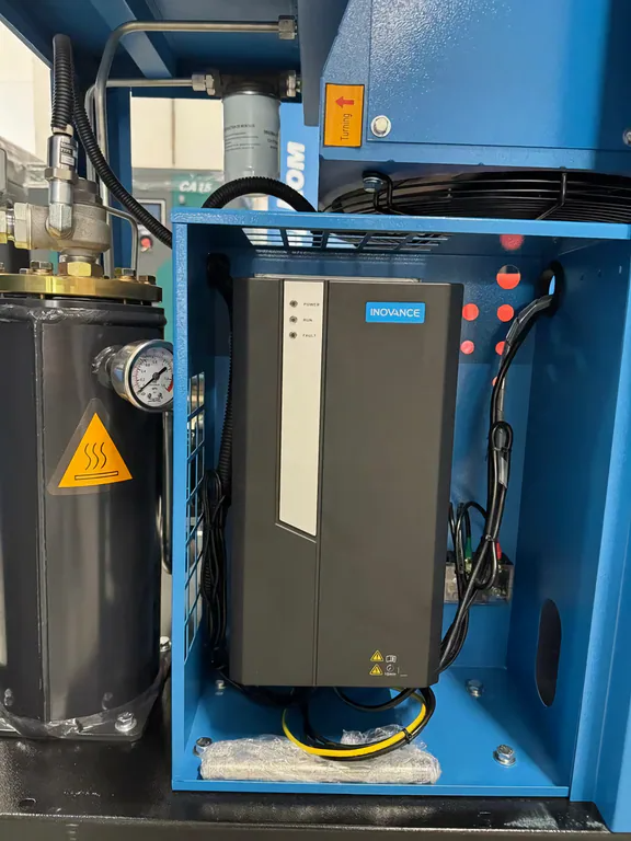 Энергоэффективный винтовой компрессор с частотным преобразователем для СТО/производства — давление 10 бар (1.0 МПа), производительность 0.9 м³/мин. Прямой привод, синхронный двигатель Anch, размер 850x600x840 мм, вес 119 кг.