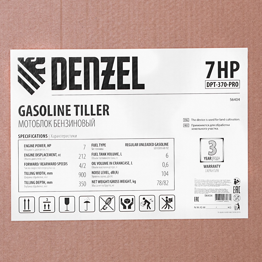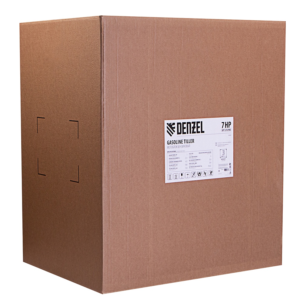 <p>Самый эффективный из представленных в линейке, мотоблок Denzel DPT-370-PRO 56404 мощностью 7 л.с. рассчитан на участки площадью до 1-2 гектаров. Сырой или вязкий грунт, глинистая почва, целина или большое поле — все эти задачи под силу четырехтактному двигателю Denzel.,Для рыхления, измельчения или выравнивания почвы используются 24 фрезы диаметром 35 см. Их обслуживание сведено к минимуму и не требует повторной заточки. Режущие элементы без труда уходят на глубину 35 см и захватывают до 90 см в ширину.</p><h2>Преимущества</h2><ul><li>4 скорости вперед и 2 назад — несколько режимов работы помогут справиться с почвой любого типа, маневрируя в узких местах, и без труда вытащить мотоблок даже из сложного грунта.</li><li>Длительная обработка почвы — емкий топливный бак на 6 л и двигатель из серии Denzel Long Life обеспечивают экономичное потребление бензина (примерно 1 л/час) и позволяют обработать большую территорию, не теряя времени на дозаправку.</li><li>Высокая производительность — надежные фрезы из закаленной стали обеспечивают оптимальную скорость вспахивания даже слежавшейся земли.</li><li>Широкий спектр задач — благодаря надежному механизму сцепления на мотоблок легко закрепляются дополнительные фрезы, тележки, приспособления для высадки клубней и сбора урожая, косилки и прочая вспомогательная техника.</li><li>Настройка глубины вспахивания — сошник регулируется по высоте и позволяет погружать почвофрезы на глубину до 35 см, идеально обрабатывая разные участки земли, и дополнительно обеспечивая устойчивость мотоблока.</li><li>Система LO-protection — двигатель не заведется при недостаточном уровне масла, что гарантирует его сохранность и повышает ресурс работы всего мотоблока.</li><li>Долговечность — стальной коленвал, закаленный до твердости 45-50 HRС в паре с качественно отлитым распредвалом гарантируют надежную и стабильную работу независимо от типа почвы и времени года.</li><li>Безопасная работа — специальный щиток ограждает пользователя от попадания земли, грязи и посторонних предметов.</li><li>Усиленная конструкция — рама надежно защищает мотоблок от механических повреждений и способна выдержать длительную эксплуатацию даже в зимнее время.</li><li>Устойчивость на любом грунте — мотоблок отцентрован на заводе и отлично удерживает равновесие, поэтому подойдет даже неопытным пользователям.</li><li>Эргономика в деталях — рукоятки изогнутой формы обеспечивают удобный захват, находятся на оптимальном расстоянии друг от друга, усилены металлической перекладиной и гасят вибрации благодаря прорезиненным наконечникам.</li><li>Удобство эксплуатации — основные элементы управления вынесены на рукоятки, поэтому оператор сможет быстро настроить оптимальный режим под тип грунта, не наклоняясь.</li><li>Уверенное сцепление с любой поверхностью — пневматические колеса диаметром 49 см защищены от проколов протекторами и обеспечивают хорошую амортизацию, поэтому пройти получится даже по неровному участку, не боясь за оборудование.</li><li>Быстрая заправка без брызг — горловина топливного бака увеличена, что сокращает время на его заполнение и позволяет избежать разбрызгивания бензина.</li><li>Расширенная гарантия 3 года — качество мотоблока подтверждено производителем.</li></ul>