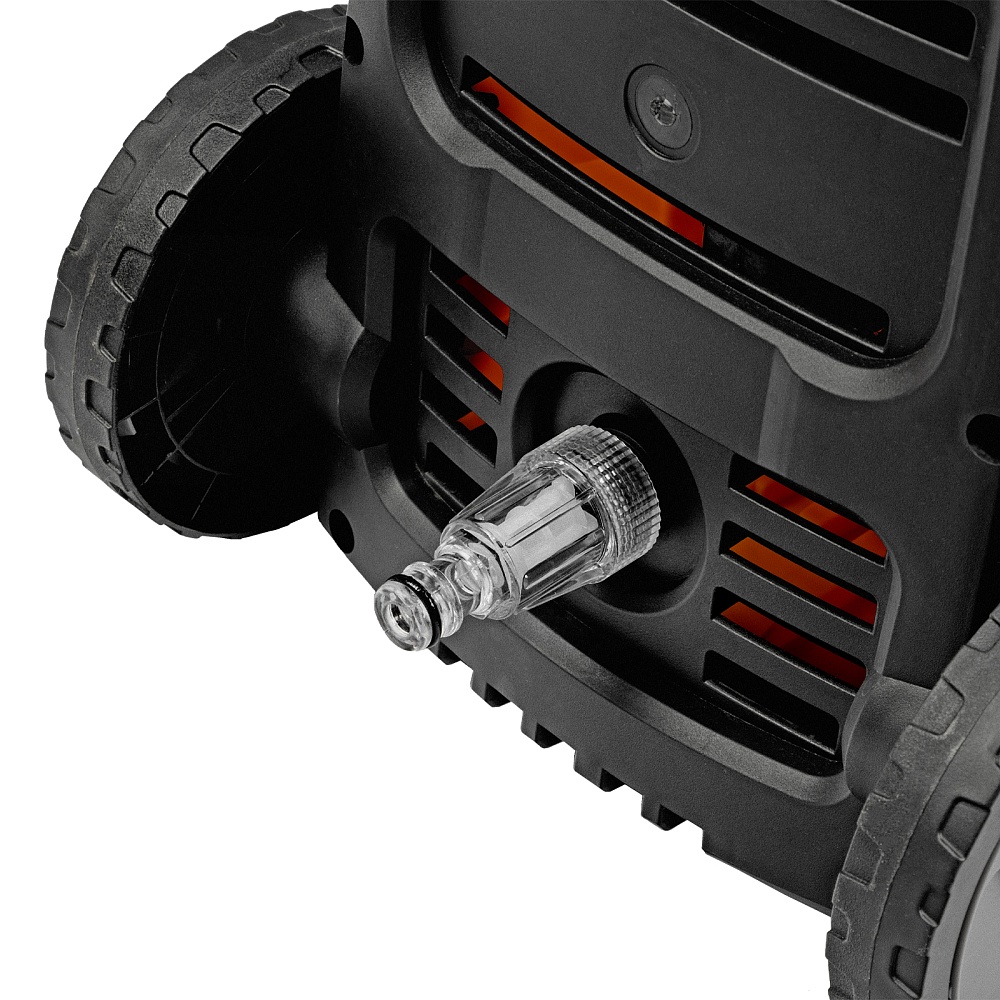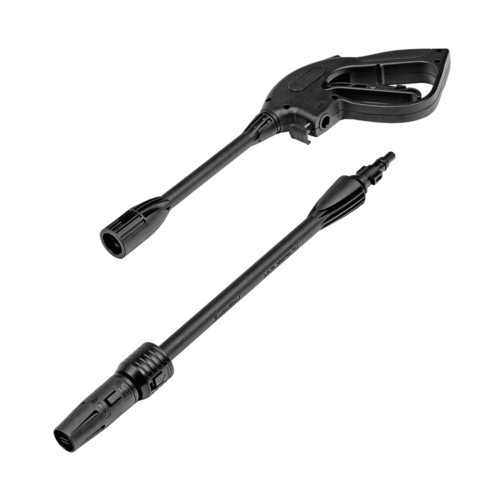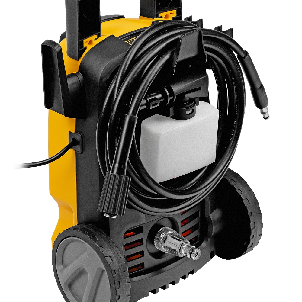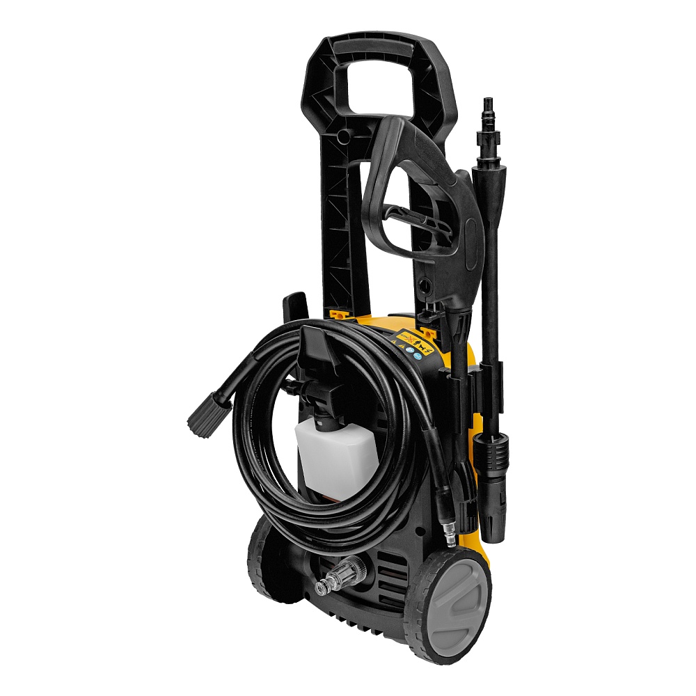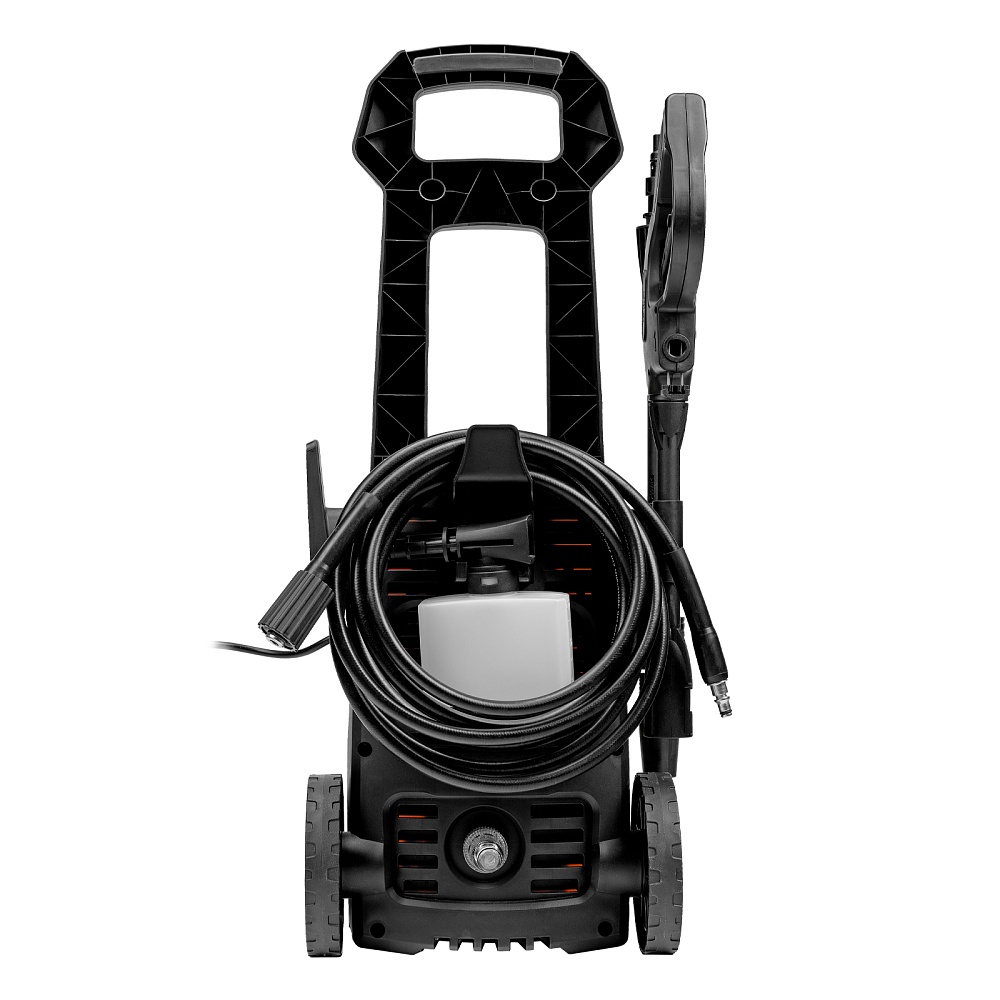Мойка высокого давления, Шланг высокого давления, Пистолет моечный, Насадка-удлинитель пистолета, Регулируемая насадка-сопло, Пеногенератор с бачком для моющего средства, Входной штуцер с фильтром, Быстросъемный коннектор шланга, Игла для прочистки сопла, Кронштейн-держатель пистолета, Кронштейн для кабеля питания, Комплект крепежа, Инструкция по эксплуатации с гарантийным талоном