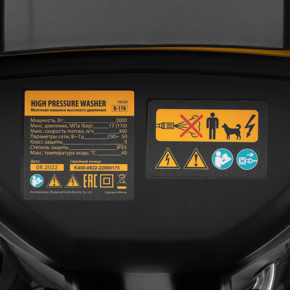 <p>Колесная моечная машина высокого давления Denzel R-170 58228 мощностью 2000 Вт и производительностью 360 л/ч подает струю воды под давлением 170 бар и используется для очищения поверхностей. Позволяет быстро удалить загрязнения с кузова автомобиля, мотоцикла, велосипеда, садового и хозяйственного инвентаря, очистить садовую дорожку и террасу, а также стены и окна строений. Источником воды может служить водопроводная линия, а также любая емкость — машина способна работать в режиме самовсасывания. Мойка пригодится владельцам загородных участков.</p><h2>Преимущества</h2><ul><li>Надежность — двигатель с медной обмоткой обеспечивает стабильную работу моечной машины даже при высоких нагрузках.</li><li>Защита от перегрева — термозащита отключает двигатель в случае перегрузки, предохраняя его от поломки.</li><li>Высокий ресурс — алюминиевая помпа рассчитана на интенсивное использование.</li><li>Экологичность — машина работает без вредных выхлопов и неприятных запахов.</li><li>Система фильтрации — вода поступает без посторонних примесей, что увеличивает срок службы машины.</li><li>Класс защиты II — двойная изоляция токопроводящих элементов надежно защищает пользователя от поражения электрическим током.</li><li>Установка оптимального вида распыления — насадка-удлинитель оснащена регулируемым соплом.</li><li>Блокировка рычага пистолета — защита от случайного запуска обеспечивает безопасность пользователя.</li><li>Комфортная работа в труднодоступных местах — насадка-удлинитель позволяет очистить самые удаленные уголки.</li><li>Эффективная работа — можно использовать моющее средство, для которого предусмотрен встроенный бачок.</li><li>Простое подключение — быстросъемный адаптер позволяет легко присоединить входной шланг.</li><li>Длина шланга и кабеля 5 м — не нужно часто перемещать машину, можно работать на удалении от розетки.</li><li>Несложный уход — в комплект поставки входит игла для прочистки сопла.</li><li>Мобильность — мойка оснащена колесами и ручкой для удобного перемещения. </li><li>Гарантия 3 года — высокое качество машины подтверждена производителем.</li></ul>