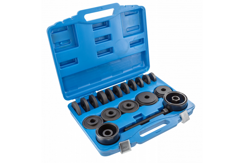 Комплект предназначен для снятия и установки ступичных подшипников, шестеренок, шкивов, валов и других запрессованных деталей, используемых в механике. Благодаря  конструкции отдельные элементы предотвращают повреждение ступицы во время работы. Комплект используется в профессиональных мастерских и автосервисах. Дополнительным преимуществом является возможность использования на гидравлическом или механическом прессе при демонтаже подшипников, втулок и других поворотных деталей.