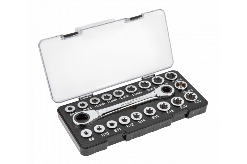 Ключ с трещоткой  и набором  насадок, которые служат  для откручивания и закручивания резьбовых соединений с шестигранными крепежными элементами или  TORX . Благодаря трещотке отсутствует необходимость перекладывания ключа, а  насадки позволяют  работать  с болтами разных размеров. 20 элементов набора позволяют работать в диапазоне от 8 до 19мм/Е8 – Е22мм.  Универсальные возможности  ключа позволяют его  использовать  как в мастерских, так и в ремонтно  - строительных и монтажных работах.