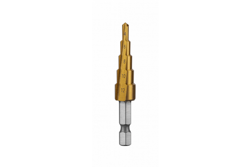 Ступенчатое сверло приспособлено для сверления различных типов стали, цветных металлов, меди, латуни и алюминия, нержавеющей стали, пластика и дерева. Позволяет сверлить точные отверстия. Оно может использоваться в кузовных мастерских, автомастерских или в работе слесарей, установщиков и электриков. Для профессионального использования.