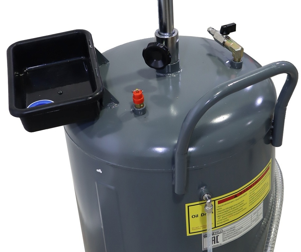 Установка KRAFTWELL, модель KRW1803.80L предназначена для сбора масла, антифриза и других технических жидкостей методом слива самотеком. Высота приемной ванны регулируется позволяя точно подобрать удобное положение при работе, а также защитить от разбрызгивания масла.  У основания приемной ванны расположен шаровый кран, перекрывающий слив жидкости в основную емкость до контроля ее состояния. Индикатор уровня, расположенный на емкости, показывает ее наполненность и вовремя сигнализирует о необходимости опустошения. Для слива жидкости из установки необходимо подключить сжатый воздух к штуцеру, расположенному в верхней части емкости. Под давлением вся жидкость выливается через гибкий шланг с жестким наконечником в емкость большего объема и затем утилизируется. Давление воздуха контролируется по манометру. Для безопасности на корпусе установлен клапан избыточного давления, который предохраняет стенки от деформации и разрушения.