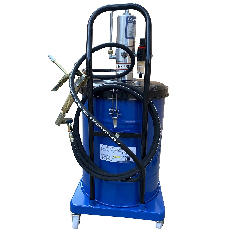 Корпус нагнетателя смазки – стальной, насос изготовлен из анодированной стали. Фиксация насоса с крышкой к баку для смазки производится с помощью металлических защелок с резьбой. Для удобства транспортировки нагнетатель оборудован металлической ручкой в верхней части корпуса. Нагнетатель оборудован маслобензостойким армированным шлангом длиной 4 м. Солидолонагнетатель для консистентной смазки, установленный на колесах, имеет легкий вес и экономичную конструкцию для удобства перемещения и эксплуатации.