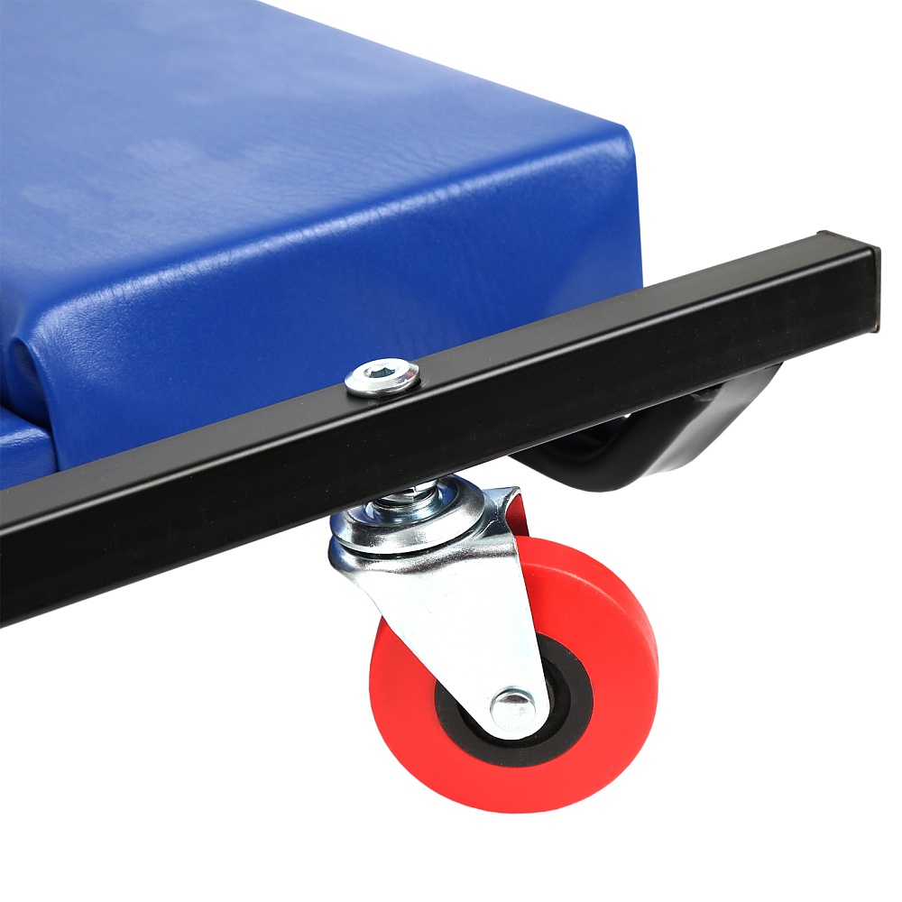 Состоит из металлической рамы с колесами и собственно лежака с поролоном в обивке из дермантина.