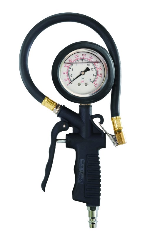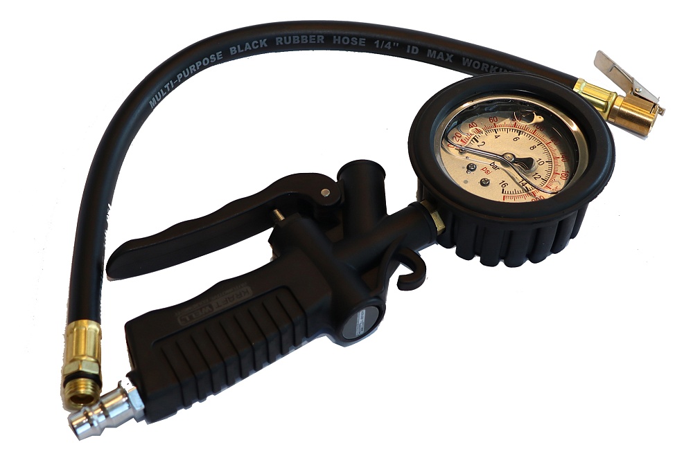 KRWTG-A2 KraftWell Пистолет для подкачки шин. В цветной коробке. Аналоговый жидкостный манометр. Пластиковая рукоятка, пластиковый курок. Давление до 16 бар.
