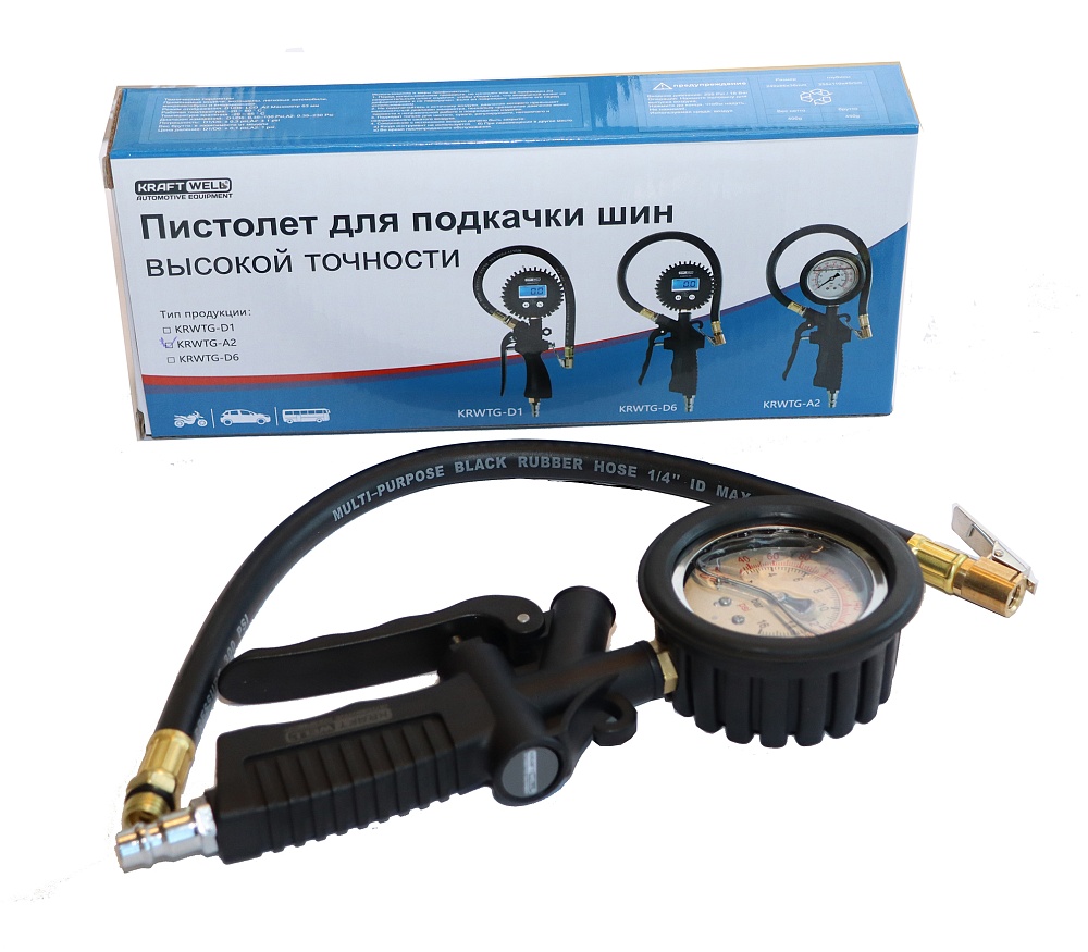 KRWTG-A3 KraftWell Пистолет для подкачки шин. В цветной коробке. Аналоговый жидкостный манометр. Пластиковая рукоятка, металлический курок. Давление до 16 бар.