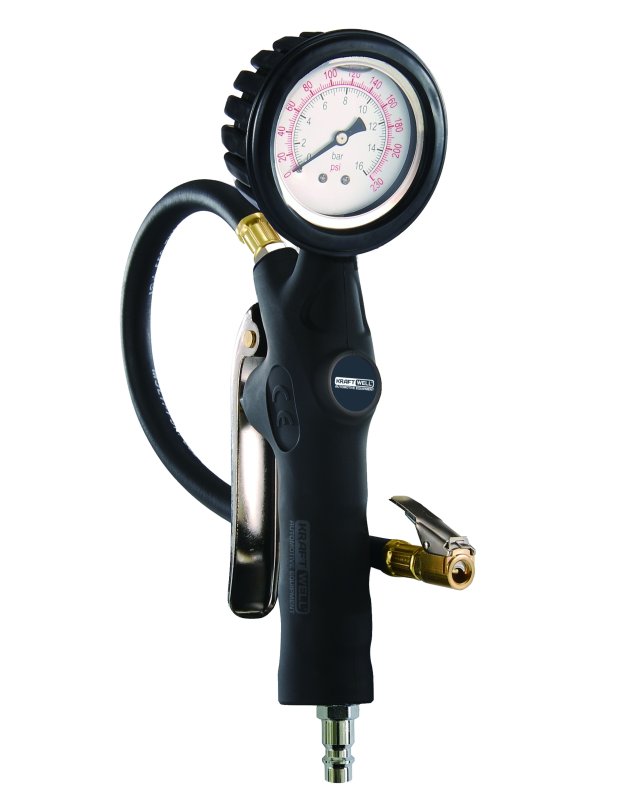 KRWTG-A3 KraftWell Пистолет для подкачки шин. В цветной коробке. Аналоговый жидкостный манометр. Пластиковая рукоятка, металлический курок. Давление до 16 бар.