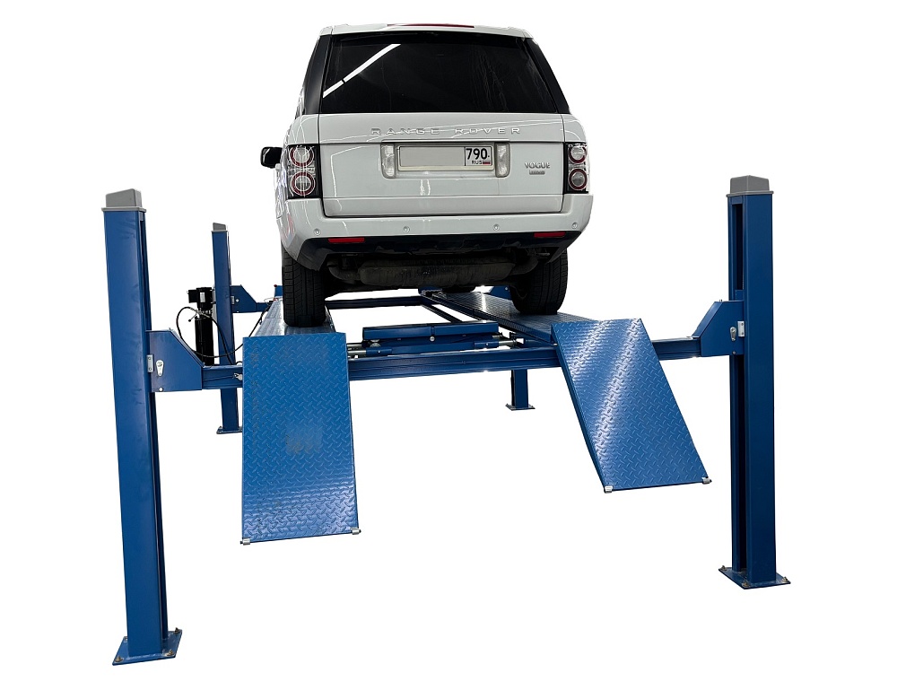 Расстояние между платформами регулируемое – 860-1200мм, что позволит обслуживать практически все автомобили независимо от ширины колесной базы. Подъемник 4х стоечный оборудован независимой гидравлической двухточечной траверсой г/п 2,0т. Также оборудован задними подвижными платформами и местами для установки передних поворотных кругов. Передние поворотные круги в комплект поставки подъёмника не входят (опция). Круги всегда входят в комплект поставки стенда сход-развал. Автомобильный электрогидравлический четырехстоечный подъемник грузоподъемность 5.5т. Предназначен для слесарных, сход-развальных работ в том числе с применением технологии 3D.
