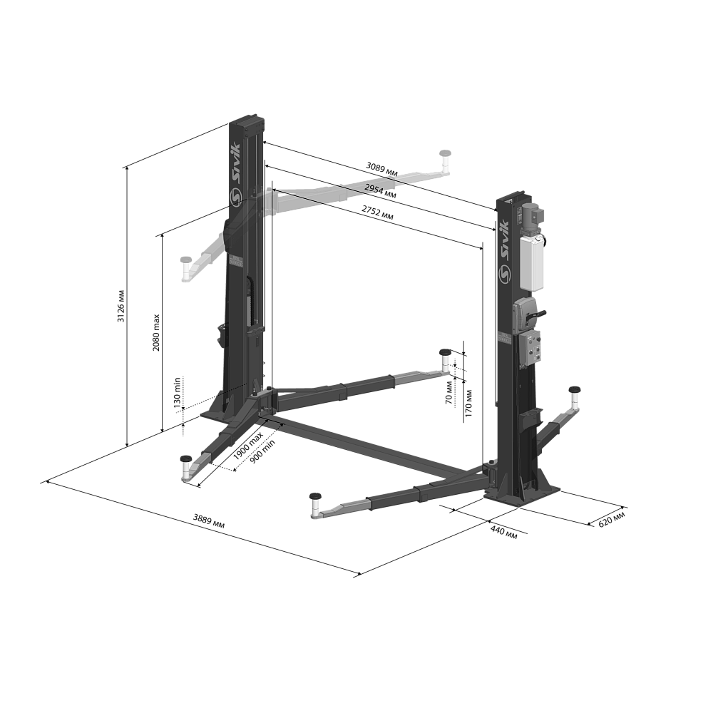 • Усиленная опора увеличенной площади не создает дополнительной нагрузки на фундамент и надежно удерживает тяжелые машины. Толщина опоры - 20 мм. Толщина косынок - 12 мм. 8 анкерных болтов обеспечивает высокую устойчивость подъемника