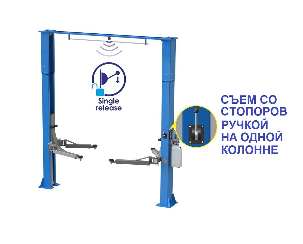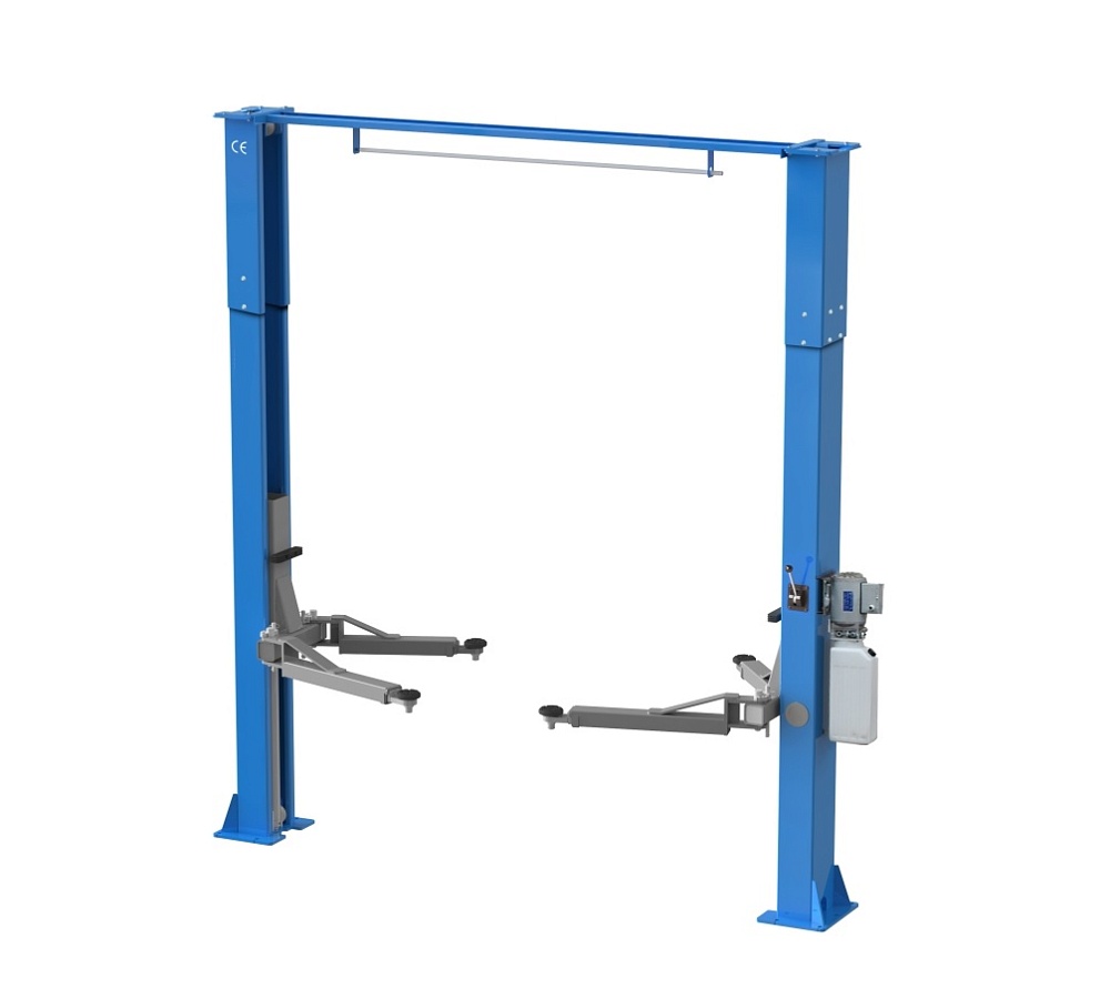Подъемник двухстоечный электрогидравлический, асимметричные каретки, цилиндры прямого действия, г/п 4200 кг., 2,2 кВт, высота подъема 1910 мм., расстояние между стойками 2840 мм., с верхней синхронизацией стальным тросом.