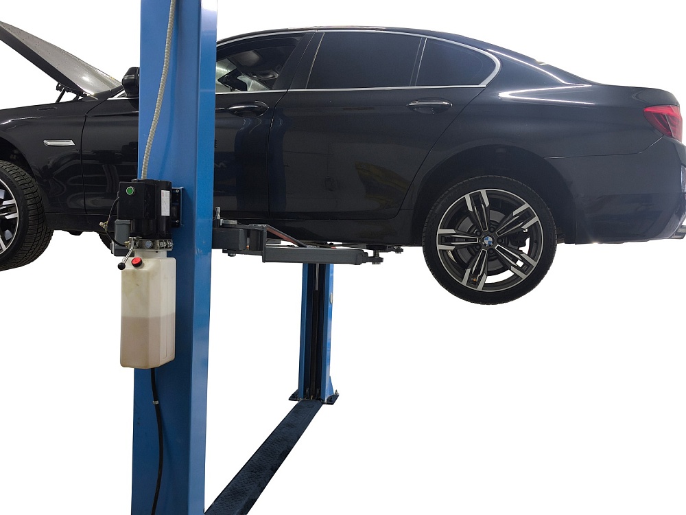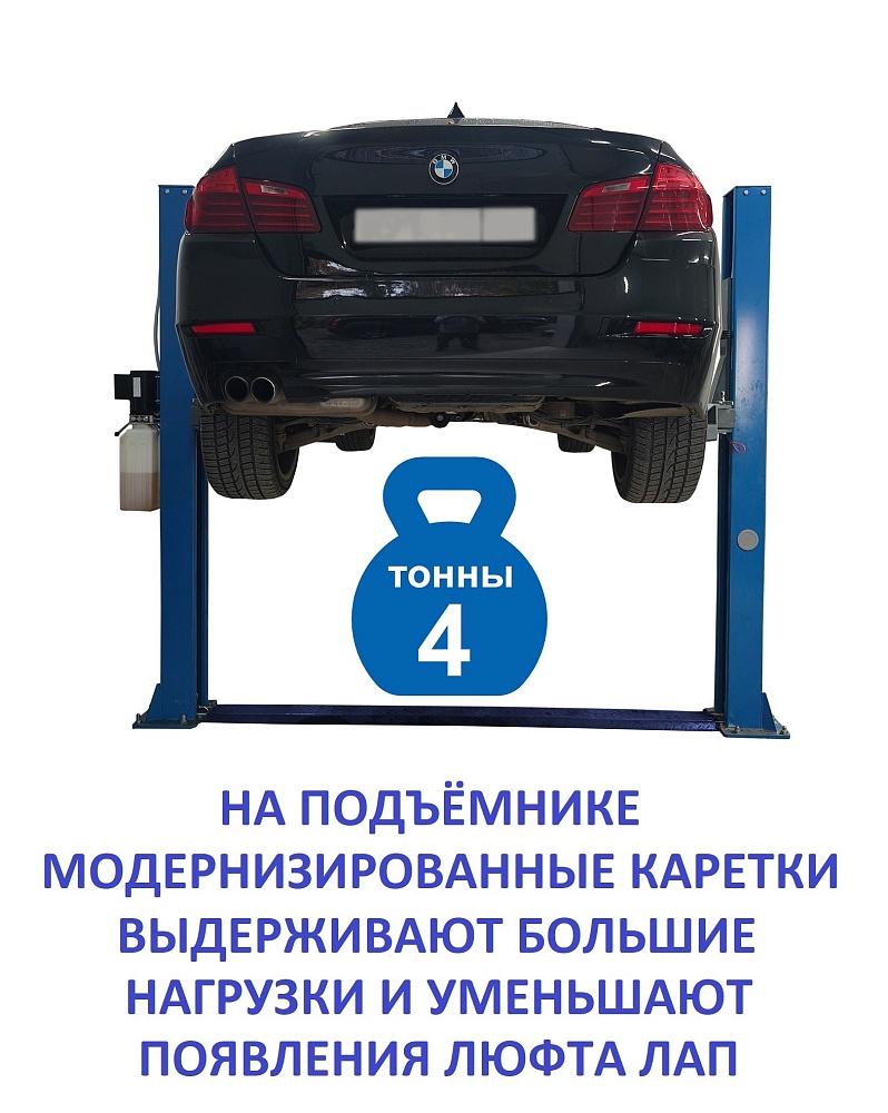Профессиональный электромеханический двухстоечный подъемник г/п 4,0 т с прямыми лапами и усиленной конструкцией кареток. Оснащён немецким гидравлическим насосом Bücher Hydraulics и тросами двойной свивки с металлическим сердечником прочностью ≥10 т на разрыв. Срок службы тросов не ограничен. Подходит для всех легковых автомобилей — от «Оки» до «ГАЗели» и внедорожников.
