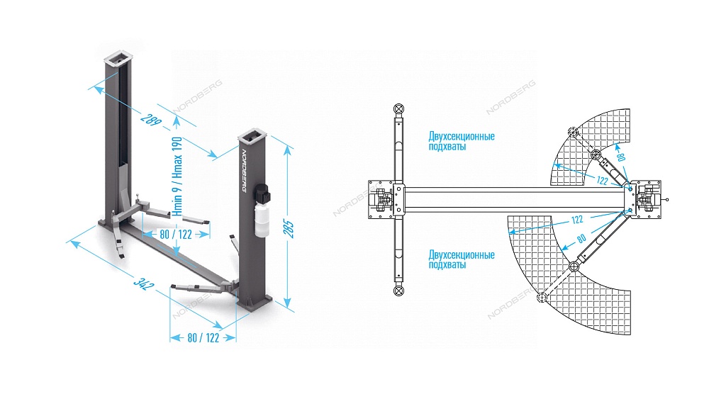 Подъемник 220V 2х стоечный 4т, со снятием стопоров с одной колонны (синий) NORDBERG N4120BM-4B купить в Омске цена ✅ - Все для СТО