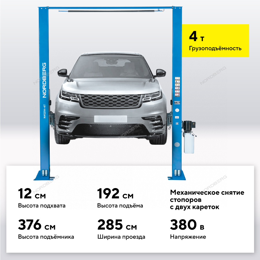 NORDBERG N4121H-4T_220 — электрогидравлический двухстоечный подъёмник с верхней синхронизацией, грузоподъёмностью 4 тонны, 220 В.