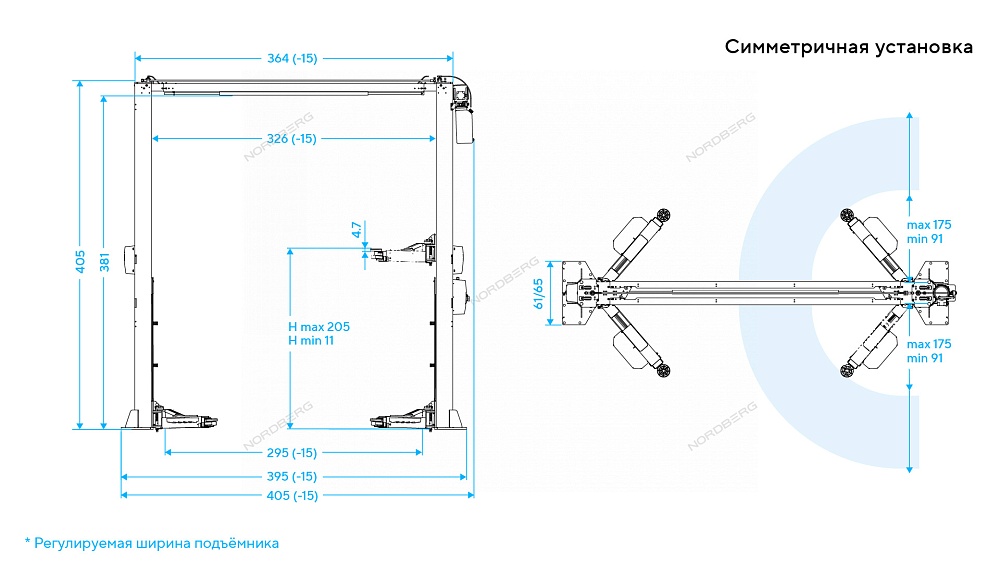 NORDBERG N4125H-4,5G — двухстоечный подъемник с верхней синхронизацией. Обеспечивает надежную фиксацию транспортного средства и равномерное распределение нагрузки.