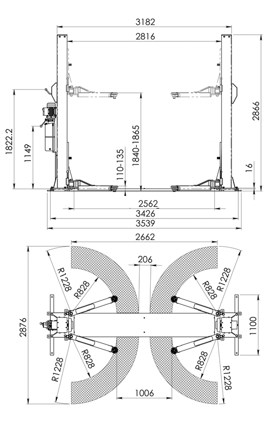 Электрогидравлический двухстоечный подъемник для легковых автомобилей, внедорожников и легкого коммерческого транспорта общей массой до 5т Классическая симметричная конструкция с удлиненными трехсоставными подхватами прекрасно подходит для работы с длиннобазными автомобилями Самая жесткая и устойчивая конструкция Нет порога между колоннами. Свободный заезд автомобиля по ровному полу. Нет ограничений при работе со вспомогательным мобильным оборудованием под автомобилем: тележки, трансмиссионные стойки и пр. Система синхронизации, расположенная сверху, не подвержена износу из-за контакта с влагой и грязью