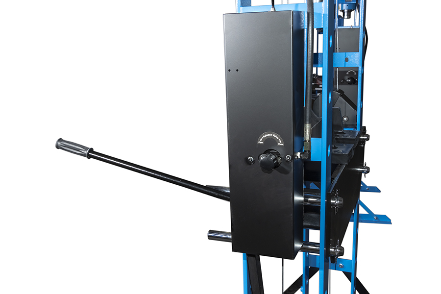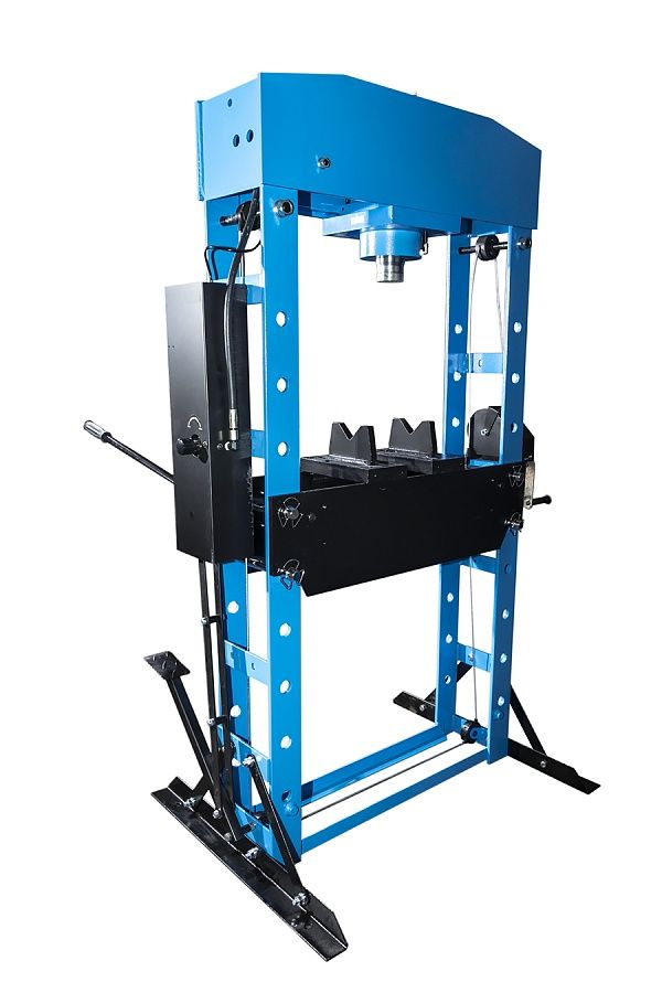 Полностью сварная рама - усилие 30 тонн. Управление ручное/пневматическое, клапан защиты от перегрузки, манометр, ручная лебедка. Гидроцилиндр с пуансоном перемещается по всей ширине каретки.