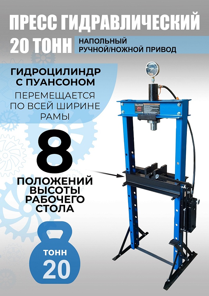 Пресс гидравлический ножной / ручной для автосервиса, усилие 20 т. «Свободные руки». ножной / ручной 20 тонн. Пуансон 0-145 мм. Рабочее окно 500х1110 мм. Доставка по РФ и ТС. Поршень приводится в действие нажатием на ручку или педаль. Рекомендуется для выпрессовки деталей машин, втулок и т.п. в автосервисе, Гараже и СТО. Гидроцилиндр с пуансоном имеет возможность перемещения по всей ширине станины. Подъёмная площадка регулируется по высоте и фиксируется в требуемом положении.