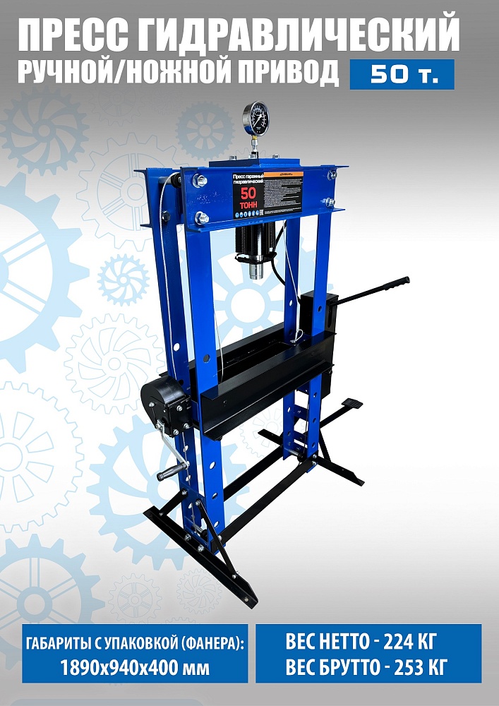 Пресс гидравлический ножной / ручной для автосервиса, усилие 50 т. «Свободные руки». ножной / ручной 50 тонн. Пуансон 0-230 мм. Рабочее окно 650х815 мм. Доставка по РФ и ТС. Поршень приводится в действие нажатием на ручку или педаль. Рекомендуется для выпрессовки деталей машин, втулок и т.п. в автосервисе, гараже и СТО. Цвет синий.