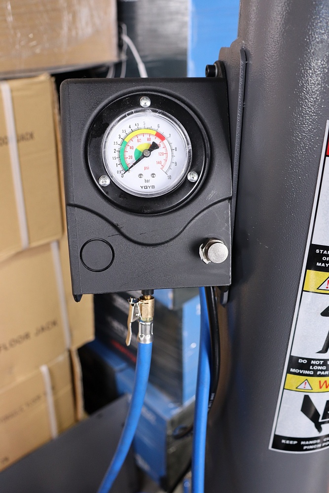 Вместо традиционного пистолета для подкачки шин используется шланг с управлением накачкой при помощи педали. Давление воздуха контролируется по манометру, установленному на колонне