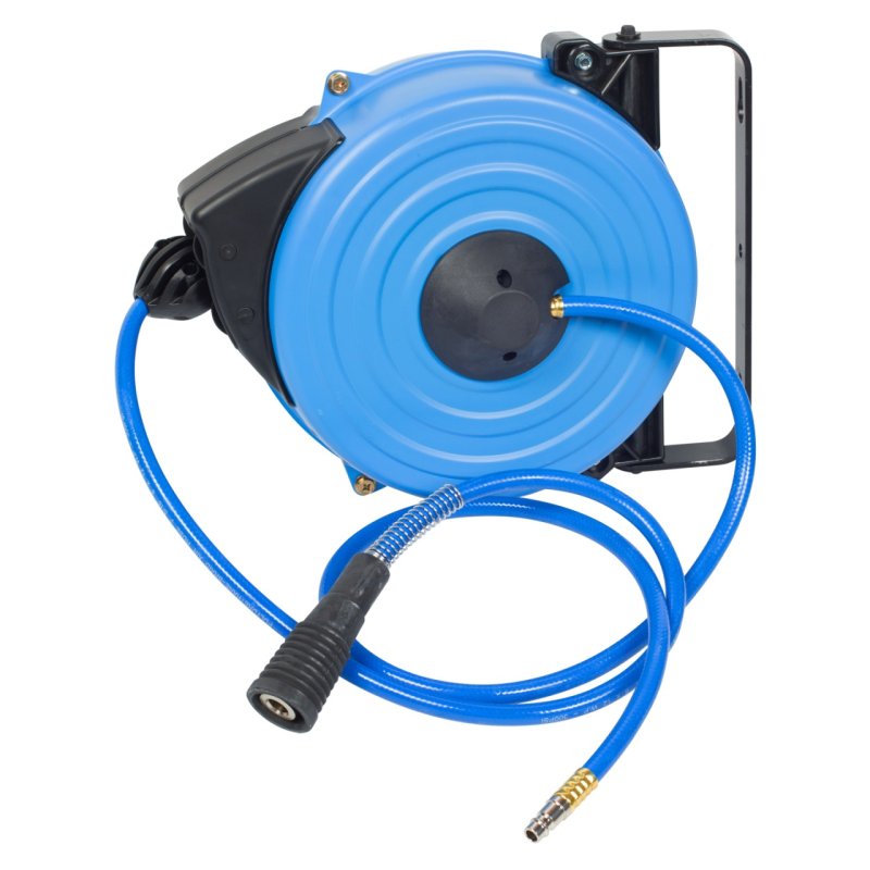 Шланг размещён на автоматической катушке закрытого типа. Конструкция автоматической катушки позволяет установить шланг на рабочем месте, закрепив его посредством кронштейна на стене, верстаке или другом любом неподвижном предмете, таким образом, чтобы при необходимости использования шланга, катушка всегда была под рукой.Фиксатор пружинного механизма катушки позволит зафиксировать шланг на необходимой длине, а по окончании работы поможет свернуть шланг обратно.