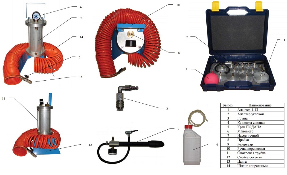 С помощью набора резьбовых присоединительных адаптеров, входящих в комплект,стенд может использоваться в любых тормозных системах автомобилей, в т.ч. оснащенных ABS. Для работы с приспособлением необходимо использовать ручной насос (не входит в комплект поставки) или внешний компрессор (не входит в комплект поставки).
