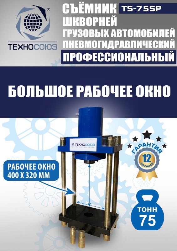 Усилие 75 тонн, пневмогидравлика, ход поршня 160 мм, диаметр шкворня до 60 мм. Рабочее окно 400×320 мм, расстояние шпилек 320 мм. Мобильный с колесами.