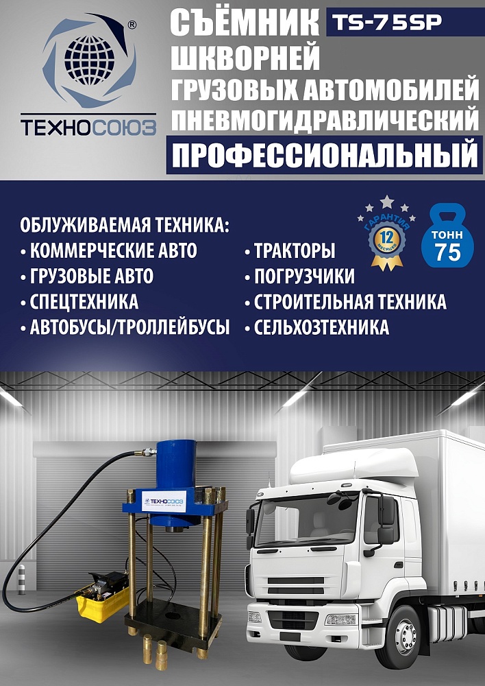 Профессиональный съемник шкворней TS-75SP для грузовиков (MAN, Mercedes, Scania, Volvo, КамАЗ, корейские/китайские), тракторов, погрузчиков, спецтехники — усилие 75 тонн, пневмогидравлика, ход поршня 160 мм, диаметр шкворня до 60 мм. Рабочее окно 400×320 мм, расстояние шпилек 320 мм. Мобильный с колесами.